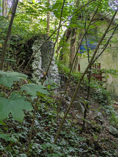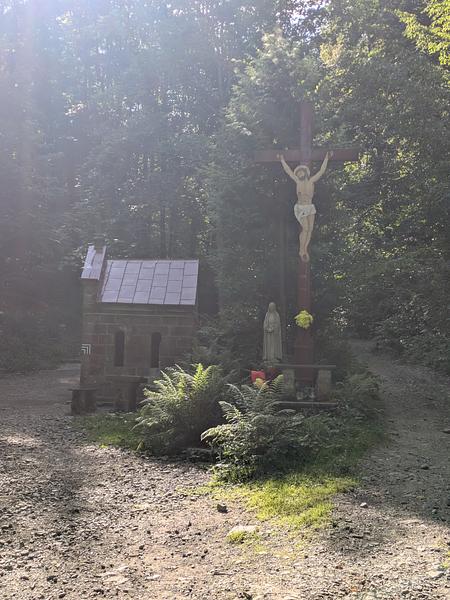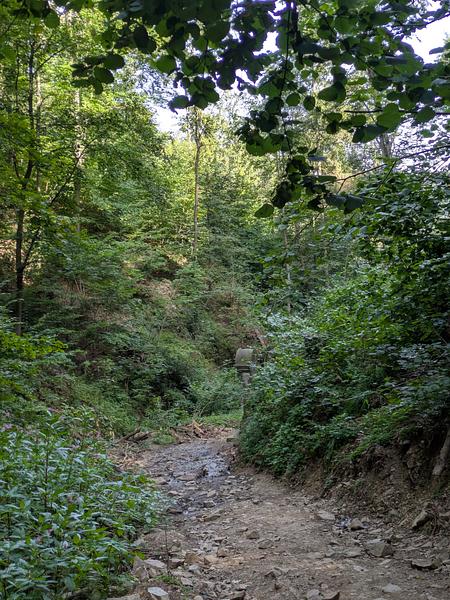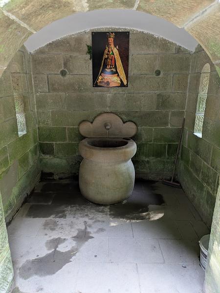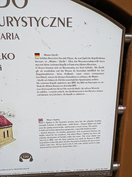 Auf halbem Weg entspringt die Marienquelle und stellt wohl eine willkommene Rastmöglichkeit beim Aufstieg zur Kapelle da. Der Wanderführer versprach "wohlschmeckendes" Wasser, mit dem man sich die Flaschen füllen sollte. Und das Erklärschild wies auf die heilende Kraft für die Augen hin. Heilend für Muskeln, Gelenke und Knochen wären mir natürlich lieber, aber vielleicht bekomme ich noch eine Erleuchtung.