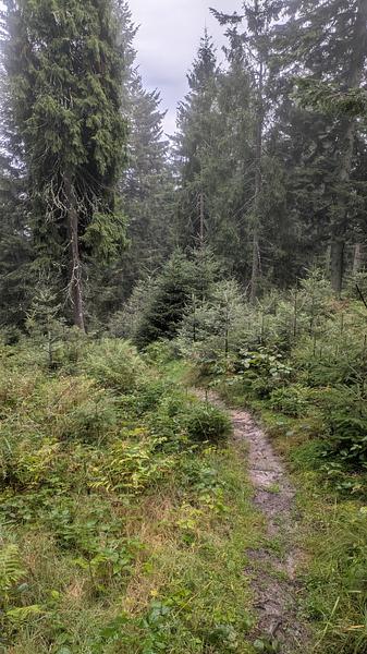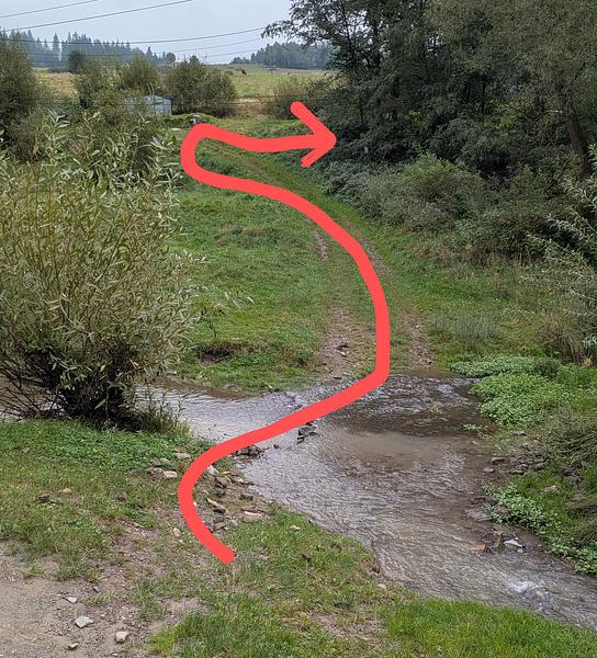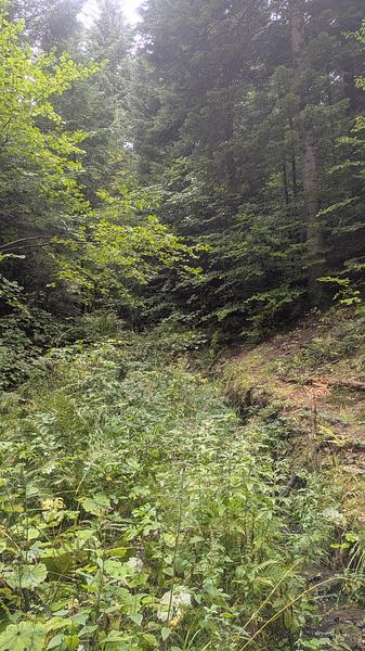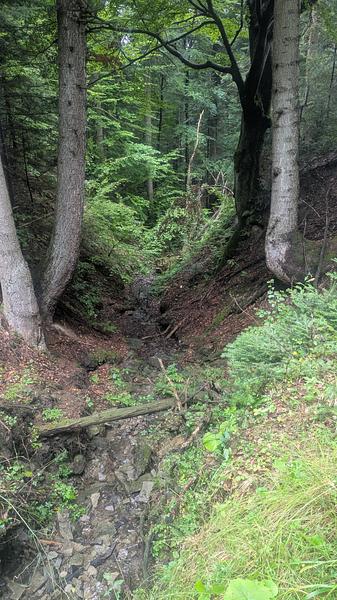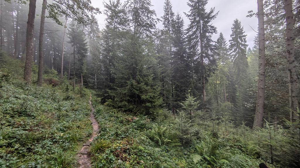 Ausgerutscht bin ich entlang des Weges ja schon häufiger. Heute hat es mich so erwischt, dass sowohl ich als auch meine Klamotten voller Schlamm waren. So konnte ich unmöglich unter Leute - zwar begegnen einem in dieser Gegend kaum Wanderer, aber spätestens die nächste Gastgeber wären sicher erstaunt gewesen. Die Lösung? Spontaner Waschtag am nächsten Bach. Hände, Wanderstöcke und Regenjacke waren einfach. Aber die Hose? Nun ja - nicht schön aber wirkungsvoll - Hose auch im Bach gewaschen (wie gesagt, kommt ja keiner entgegen so dass man da halbnackt stehen kann), gut ausgewrungen, unter Protest angezogen und dann beim Weiterwandern trocknen lassen.